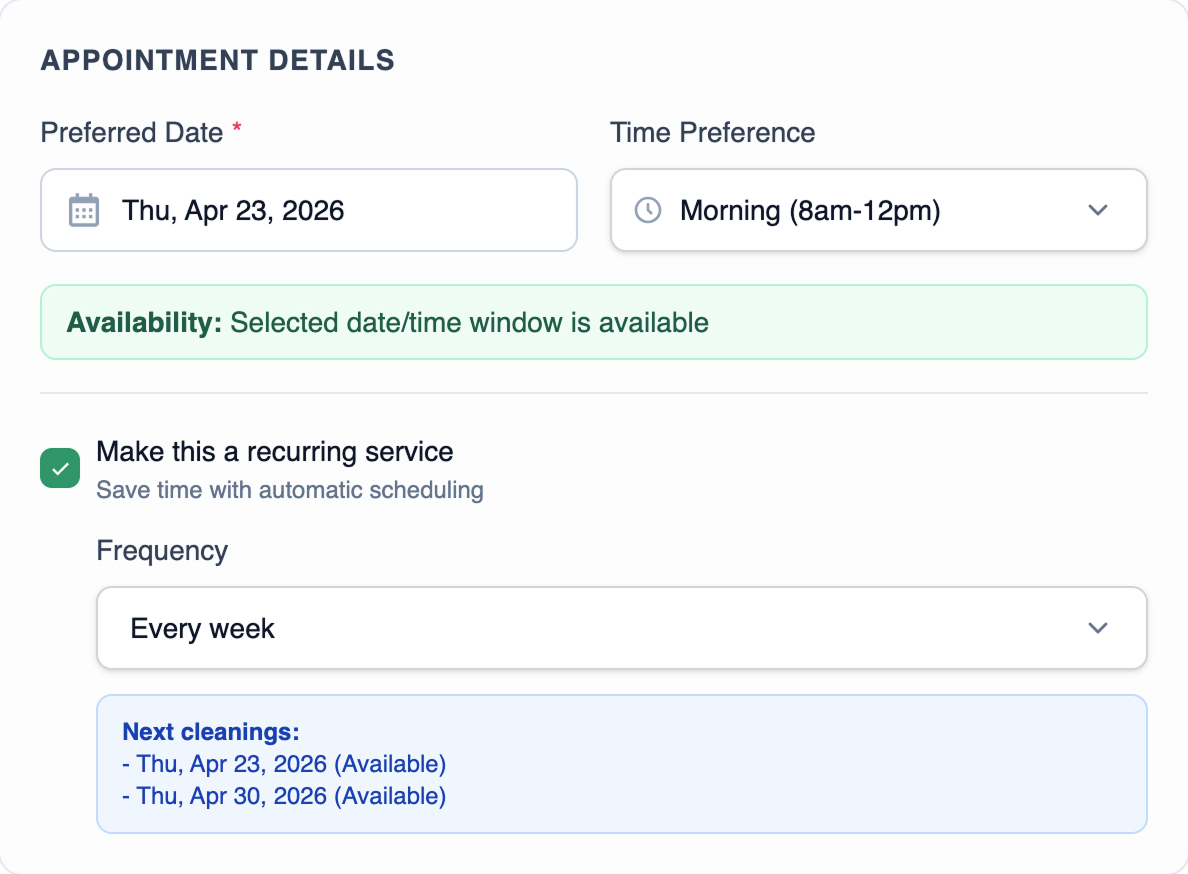 Capture service details, access instructions, and special requirements up front. No more playing phone tag after bookings.