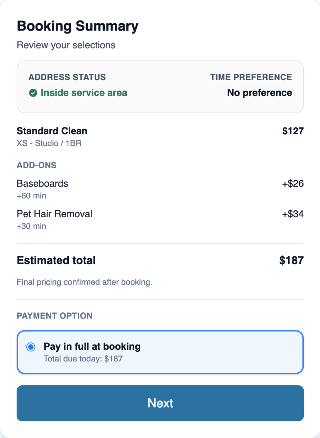 Most customers book from their phones. The booking page is designed for fast, seamless mobile experiences.